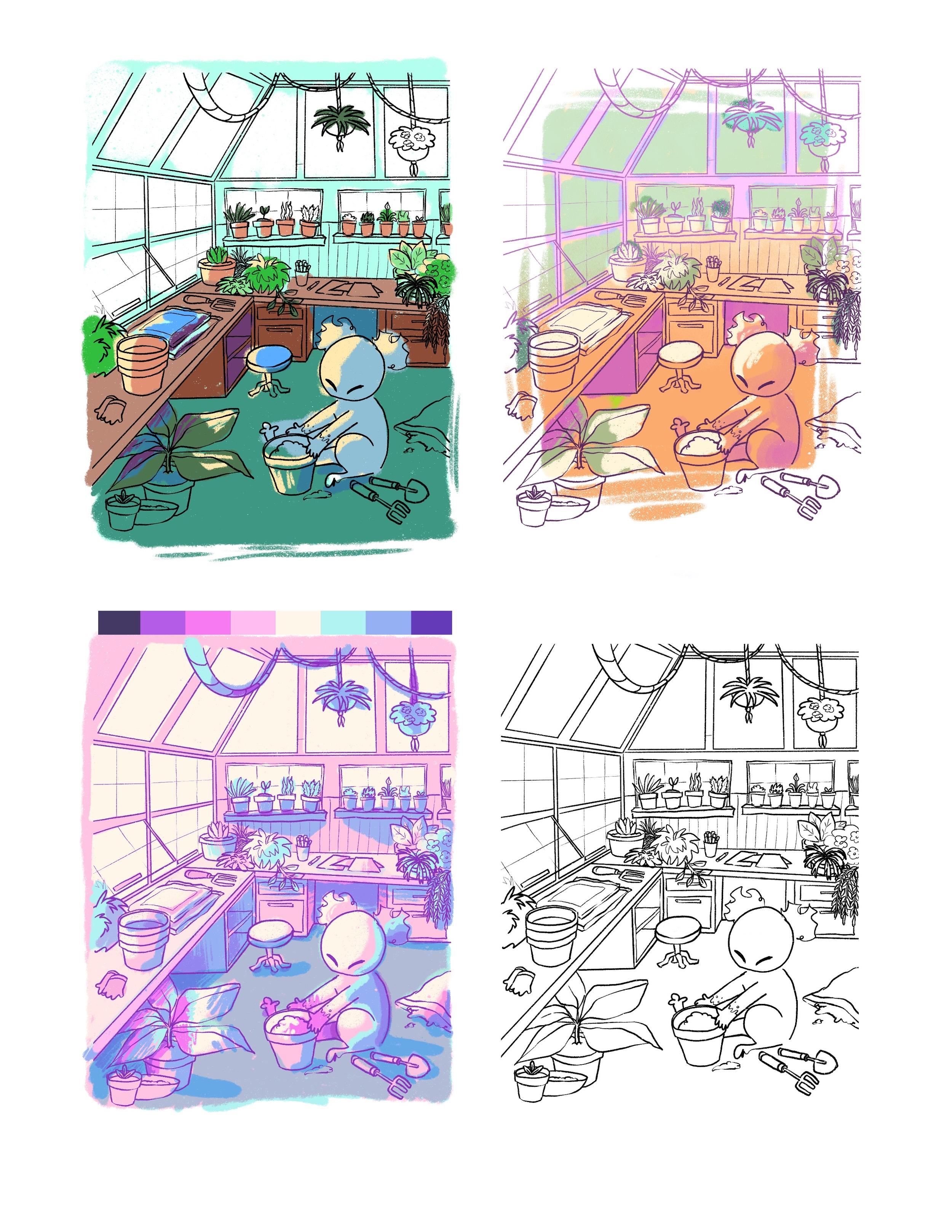 Drafting out different color palettes, practicing how each group of colors portrays a different energy to the illustration.